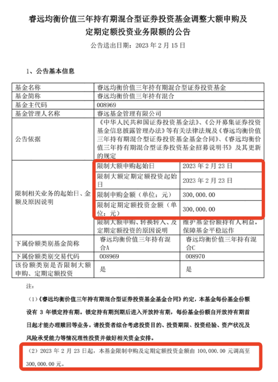 2月15日,睿远均衡价值三年持有期混合基金发布调整大额申购及定期定额投资业务限额的公告。公告称,维护基金份额持有人利益,保障基金平稳运作,自2023年2月23日起,本基金限制申购及定期定额投资金额由10万元调高至30万元。
