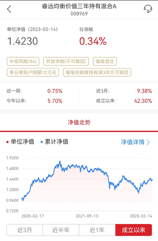 相关资料显示,睿远均衡价值成立于2020年2月21日,截止今年2月14日,该基金成立以来净值上涨42.29%。