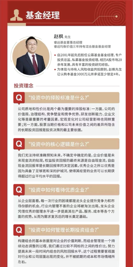 2020年1月,睿远均衡价值三年持有期混合基金披露发售公告之际,公告中就提及,为体现与本基金基金份额持有人风险共担的原则,本基金基金经理在首次募集期内将认购本基金 3000万元,上述认购将自份额确认之日起锁定4年。本基金基金经理认购部分不参与配售。