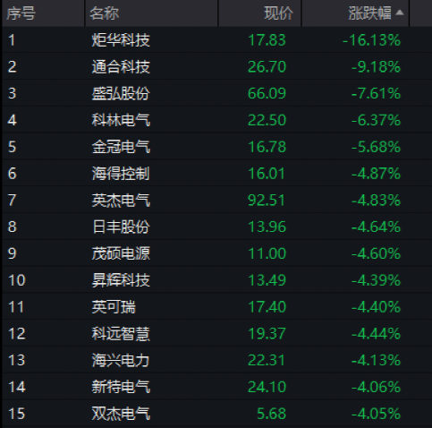 2月16日上午,充电桩板块低开低走。炬华科技跌超16%,通合科技跌超9%,盛弘股份跌超7%,茂硕电源、英可瑞等前期活跃个股快速走弱。