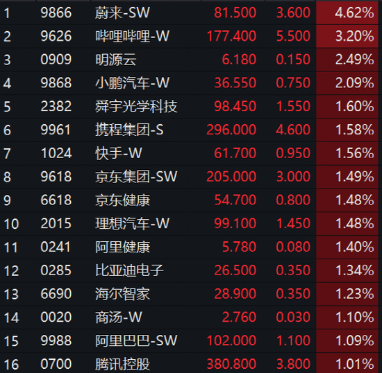 新能源车企领涨,蔚来涨近5%,小鹏涨超2%;哔哩哔哩、携程、快手等涨幅居前。