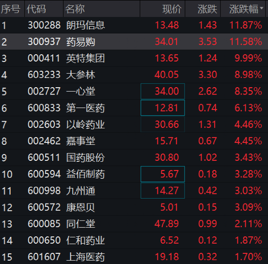 2月16日上午,医药电商概念冲高,一众药房股高开高走。英特集团开盘迅速涨停封板,朗玛信息、药易购涨近12%,大参林逼近涨停线,一心堂、第一医药涨幅居前。