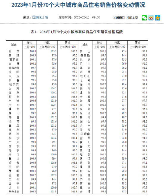 2月16日,国家统计局最新公布的2023年1月份商品住宅销售价格变动情况统计数据——