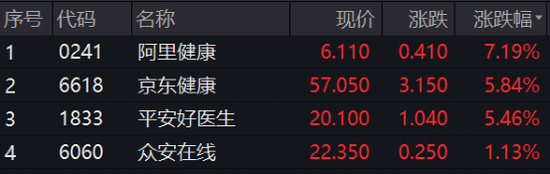 与此同时,港股互联网医疗板块同步拉升,阿里健康涨超7%,京东健康、平安好医生涨超5%。