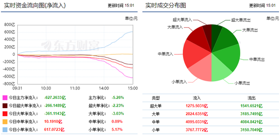 从两市主力资金流向来看,截止收盘,沪深两市主力资金呈现大幅净流出状态,两市共流出627.2633亿元。其中,超大单净流出266.1489亿元,大单净流出361.1143亿,中单净流入10.1910亿元,小单净流入617.0723亿元。