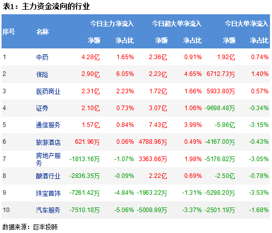 从两市行业板块资金流向来看,种业板块获主力资金净流入4.28亿,保险板块获主力资金净流入2.90亿,医药商业板块主力资金净流入2.31亿,证券板块主力资金净流入2.10亿,通信服务板块主力净流入1.57亿。