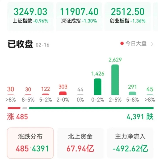 周四(2月16日),A股三大指数震荡回落,全线下跌。截至收盘,上证指数跌0.96%报3249.03点,深证成指跌1.30%报11907.4点,创业板指跌1.36%报2512.5点;两市合计成交金额达11930亿元,自2月2日以来首次突破万亿元。北向资金净买入67.94亿元。总体上看,两市个股跌多涨少,近4400只个股下跌。其中,涨停个股达23只,跌停个股达4只。