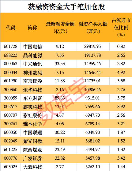 中国电信融资净买入额居首,当日净买入2.98亿元,其次是晶科能源、中兴通讯,融资净买入金额分别为1.91亿元、1.5亿元,融资净买入金额居前的还有神州数码、南京证券、炬华科技等。