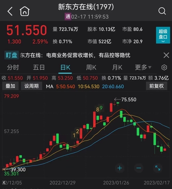 新东方的股价也从此前75.55港元的高位,一路跌至50港元附近,下跌超30%。不过随着董宇辉昨晚的声明,17日早盘,新东方在线的股价止跌回升。早盘一度拉升近6%。