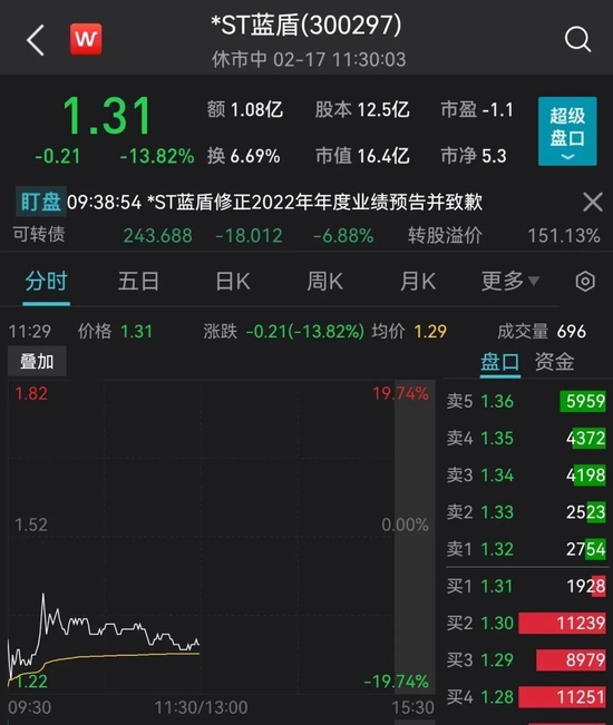17日早盘,沪深两市中跌得最惨的就是*ST蓝盾(维权),开盘一度跌停,截至午间收盘,报收1.31元,下跌13.8%。