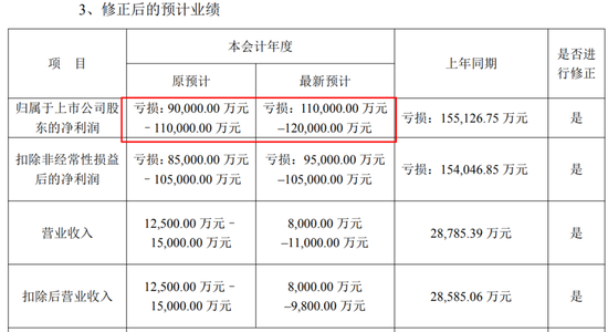 17日早间,公司发布下修业绩预告,预计2022年年度实现归属于上市公司股东的净利润为亏损11.00亿元-12.00亿元,扣除非经常性损益后的净利润为亏损9.50亿元-10.50亿元。