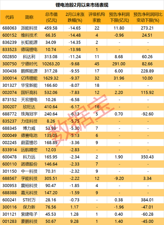 2月以来锂电池行业指数走低,申万锂电池指数累计下跌5.02%。行业半数以上个股跌逾5%,龙头宁德时代下跌9.68%,千亿巨头亿纬锂能下跌9.37%,科达利、德瑞锂电、长虹能源、维科技术、派能科技跌逾10%。