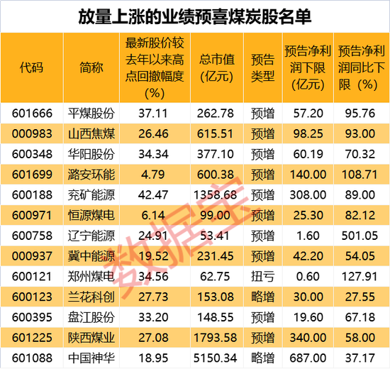 今日多只业绩预喜股股价放量上涨。平煤股份上涨5%,5日量比达3.11,公司是中南地区焦煤龙头,是国内优质低硫主焦煤第一大生产商和供应商,公司2022年业绩预增,预测净利润约57.2亿元,同比增长约95.76%。煤炭行业发展势头良好,煤炭价格处于高位运行,公司得益于大精煤战略,规模效益持续释放,公司业绩稳步上升。