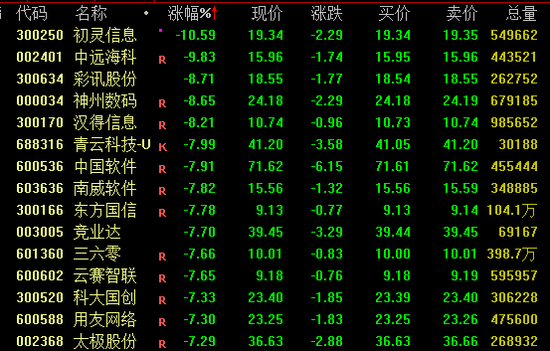 近期热门的信创、大数据等数字经济概念大幅回落,截至收盘,初灵信息跌超10%,中远海科逼近跌停,神州数码、汉得信息跌超8%,中国软件、竞业达、三六零、科大国创、太极股份等跌超7%。