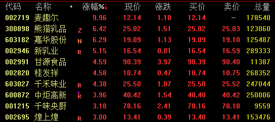 食品饮料股盘中发力走高,乳业股表现活跃,截至收盘,麦趣尔涨停,熊猫乳品涨超6%,新乳业涨超5%,燕塘乳业、西部牧业等均走强。其它个股方面,甘源食品、桂发祥、千禾味业涨超4%,中炬高新、千味央厨涨超3%。