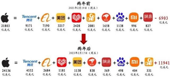 例如,美国自20年起,在不断扩大对我国企业所谓“实体清单”名单的同时,颁布法令禁止美国投资者交易相关的中国国内企业的任何证券;抛出所谓的《外国公司问责法案》,对于在美上市的中概股审计要求空前加强,并试图通过这种方式迫使我国互联网、高科技企业离开美股这一享受“估值溢价”的市场;上周(2月16日),路透社更是报道,拜登政府计划完全禁止对一些中国科技公司的投资,并加强对其他公司的审查,倘若这一法案正式落地,将对依托海外资本融资的我国互联网、初创型科技企业等构成重要的影响:过去两年,苹果市值增加2333亿美元,但中国在美股及港股上市的主要科技与互联网公司市值出现了明显下降;两年前,包括腾讯、阿里巴巴在内的九大科技与互联网公司市值之和较苹果多出6903亿美元,但当前已比苹果市值少11941亿美元。