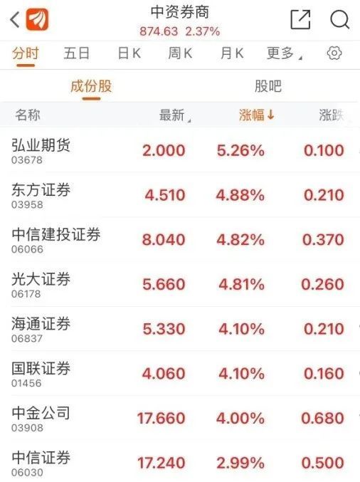 港股中资券商股也集体拉升。截至发稿,弘业期货涨超5%,东方证券涨近5%,中信建投证券涨超4%。