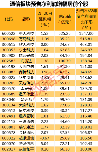 通信板块2022年度业绩普遍向好,归母净利润同比增长下限来看,已发布2022年度业绩预告的72股中53股盈利增长,报喜比例超过七成。中天科技、万马科技、欣天科技预计净利润增幅最高,分别不低于1547%、515.81%、463.01%。
