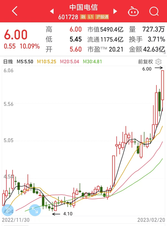 2月20日,A股三大运营商个股早盘快速拉升,带领整个板块走强。中国电信盘中涨停,创上市一年半以来最高收盘价,年内已累计上涨43.16%。中国联通、中国移动纷纷走高,分别上涨7.52%、6.49%。受龙头股大涨影响,通信板块今日逾八成个股上涨,平均涨幅1.44%。值得注意的是,通信板块目前年内累计涨幅达到16.52%,仅次于计算机板块。