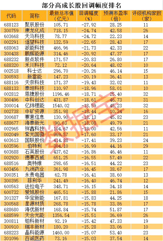 今年以来A股市场以涨为主,但逆市下跌的高成长股也不少。数据宝统计,根据10家以上机构一致预测,去年净利正增长且今年及明年净利增速均超30%的个股中,有38只个股最新价较年内高点回调超15%且按照去年预测净利计算的市盈率低于60倍。从回撤幅度来看,聚辰股份、康龙化成、天马科技、遥望科技等个股回调超过20%。