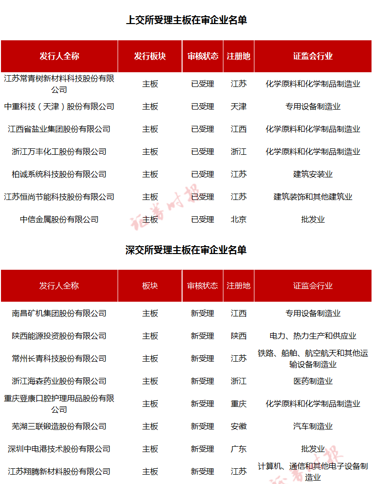 其中,上交所受理的7家主板在审企业分别为江苏常青树新材料科技股份有限公司、中重科技(天津)股份有限公司、江西省盐业集团股份有限公司、浙江万丰化工股份有限公司、柏诚系统科技股份有限公司、江苏恒尚节能科技股份有限公司和中信金属股份有限公司。
