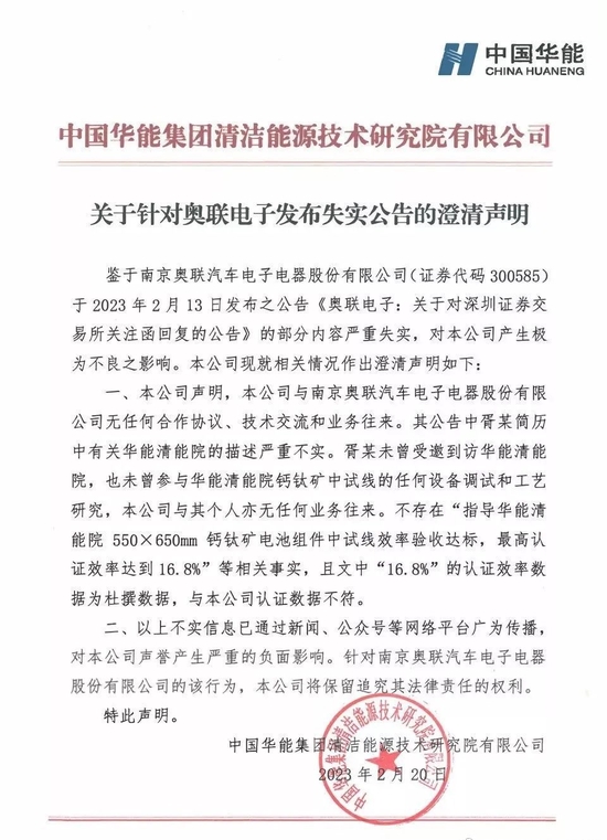 首先,21日,华能清洁能源研究院发布针对奥联电子发布失实公告的澄清声明称,本公司与南京奥联汽车电子电器股份有限公司无任何合作协议、技术交流和业务往来。其公告中胥某简历中有关华能清能院的描述严重不实。