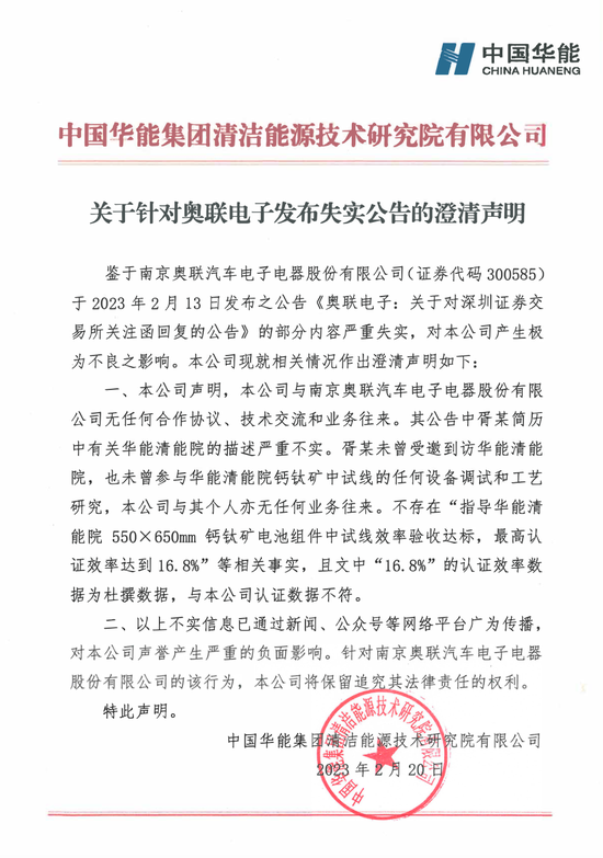 根据中国华能集团清洁能源技术研究院发布的澄清声明,其针对的是胥明军与该研究所没有业务往来,也不存在“指导华能清能院相关业务”的事实。说白了,意思就是奥联电子与胥明军设立合资公司,看重的是其在钙钛矿领域的权威资历。但胥明军是否真的存在这样的资历,现在遭到了质疑。