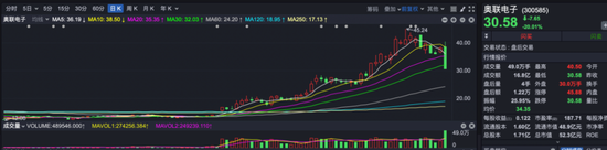 当天,奥联电子20CM涨停,之后一路走高,到今年2月9日股价见顶45.24元,累计涨幅224.5%。