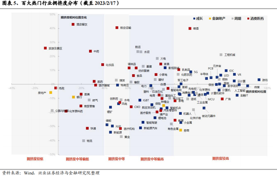 从拥挤度来看,当前消费和金融地产板块的拥挤度整体相对较低。随着去年12月下旬至今上涨后,信创、游戏等多数成长行业的拥挤度多已自底部回升至较高水平,并正逐渐步入消化拥挤度压力阶段。考虑到近期增量资金较为有限、行业轮动较快,因此拥挤度相对较低的行业的弹性或相对更高。截至2023/2/17,医药(中药、医美、创新药、医疗器械)消费(酒店餐饮、旅游及景区、航空运输)、金融地产(房地产、银行)、周期(煤炭、燃气、水电)和成长(储能、特高压、风电、光伏)等细分行业的拥挤度相对较低。