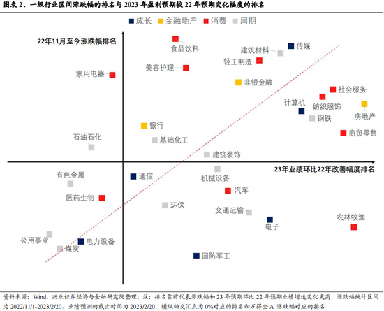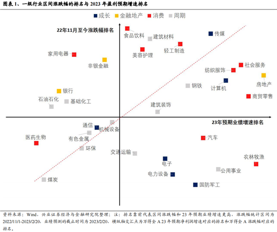 值得注意的是,相比于23年预期业绩增速的绝对水平,23年预期较22年预期业绩增速的改善幅度对去年11月至今的市场结构指引性更强。从一级行业来看,【23年预期业绩增速-22年预期业绩增速】&【23年预期业绩增速】与【2022/11/1-2023/2/20区间涨跌幅】的相关系数分别为0.4和0.1,意味着预期业绩增速的边际变化或是更有效的市场定价因子。