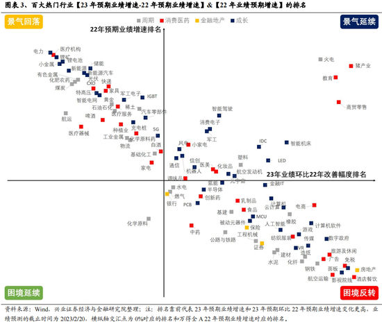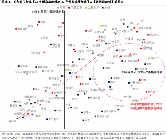 从市场表现和盈利预期改善幅度的匹配度来看,计算机、智能机床、面板、教育、猪产业、房地产、化纤和火电等板块或存在补涨空间。截至2023/2/20,百大热门行业自去年11月初以来的市场表现和其23年景气度的预期变化同样具有较为明显的正相关性(二者之间的相关系数为0.4)。因此,【23年预期业绩增速-22年预期业绩增速】&【2022/11/1-2023/2/20区间涨跌幅】排名的匹配程度在一定程度上可以体现市场是否充分反映了板块23年业绩增速的改善预期。当前,成长(面板、数字政府、计算机、LED、智能机床、被动元器件)、周期(火电、钢铁、化纤)、消费(教育、猪产业、航空运输)和金融地产(房地产、证券)等细分行业的涨跌幅排名低于其2023年预期景气度变化的排名,或指向相关行业的基本面改善预期尚未被市场充分兑现。
