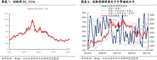 政策边际宽松信号频现,叠加估值和拥挤度处于较低水位。一方面,仿制药集采过半,企业成熟业务的业绩压力呈边际放松;另一方面,药企的创新业务经过多年培育,也陆续进入收获阶段,为业绩增长提供新的动力。与此同时,截至2023/2/21,创新药板块PE估值为32.69,处于2019年以来的22.5%的较低分位数水平,且经历调整后,拥挤度也回落至中等水平。