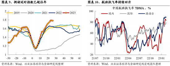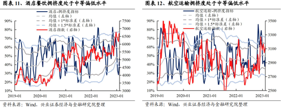 政策放松下,国内出行需求快速恢复,带动出行链业绩或超预期改善。12月上旬政策放松以来,随着各地陆续解除旅行限制,部分压抑的需求得到释放,“出行链”相关行业基本面修复良好。以航空运输和影视院线为例,航班执飞数量和票价环比持续改善,截至2月16日,国内航班量修复至2019年同期的96.61%,国内平均全票价相当于19年同期的89.46%;截至2月16日,尽管电影当日上映场次、观影人次、票房总量均季节性回落,但下行节奏放缓,总量与往年农历同期相比基本持平。向后看,参考海外疫情放开后的复苏经验(详见2022年12月4日发布的报告《深度复盘:海外四国防疫放松后的经济与股市》),出行链的修复弹性和市场表现在消费细分行业中均位居前列。对比市场表现和23年盈利预期改善幅度的匹配度来看,影视院线等出行链部分行业或仍被相对低估。与此同时,经过前期的调整,出行链相关行业的拥挤度大多都回落至中等及以下的水平。