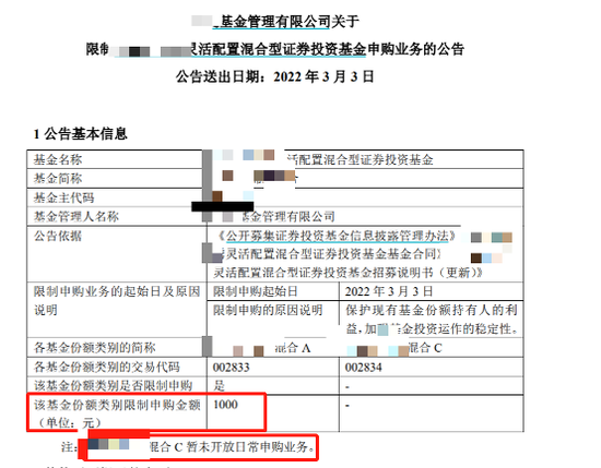 该基金最近一次限购是在2022年3月3日。该基金公告称,A份额单个投资人单日累计申购金额应不超过1000元,C份额暂未开放日常申购业务。此后,直到2月15日前,该基金一直没有放开过申购和赎回。