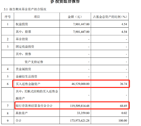 季报显示,该基金绝大多数资产存在了银行,放在了“买入返售金融资产”和“银行存款和结算备付金合计”两项中。
