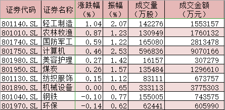 板块方面,从申万一级行业看,今日仅8个行业上涨,轻工制造和农林牧渔涨幅居前,其中仅轻工制造行业指数涨幅超1%。