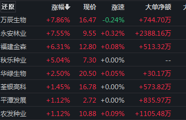 此外,种植业与林业板块拉升。万辰生物、永安林业大涨超7%,福建金森、秋乐种业等多股跟涨。