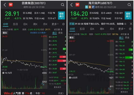 今年最大涨幅接近翻倍的因赛集团,今日跌逾8%;今年以来最大涨幅超过210%的海天瑞声,今日跌逾8%。