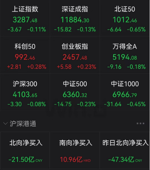 2月23日A股窄幅震荡,沪指围绕3300点反复争夺,两次冲高无力后回落,午后一度小幅跳水,但尾盘又顽强拉起。创业板指相对偏强。截至收盘,沪指跌0.11%,深成指跌0.13%,创业板指涨0.23%。北向资金全天净卖出21.5亿元,其中沪股通净买入4.92亿元,深股通净卖出26.42亿元。