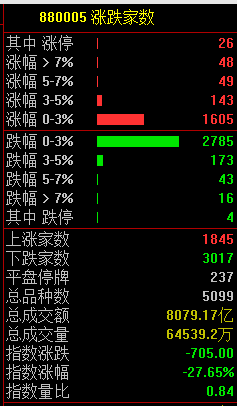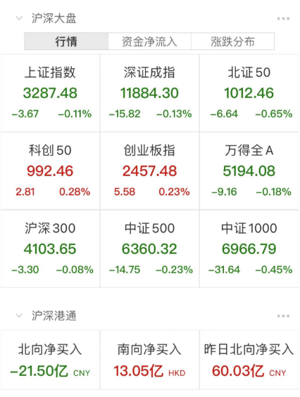 两市共1845只个股上涨,3017只个股下跌,北向资金净卖出逾21亿元。