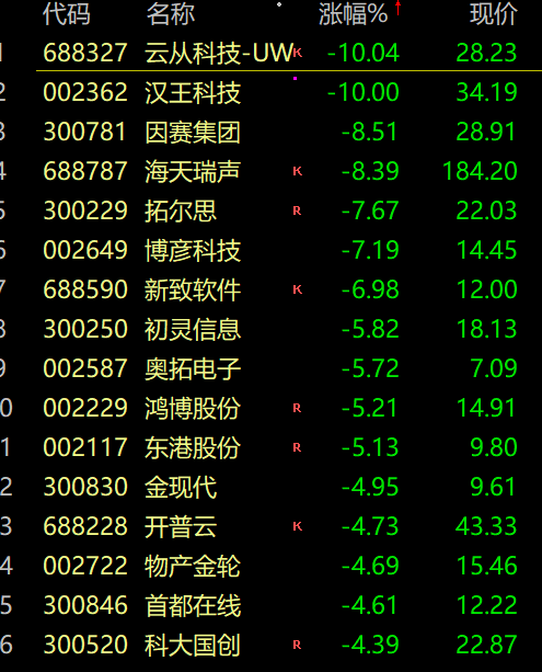 ChatGPT概念股全线走低,汉王科技跌停,云从科技跌超10%,海天瑞声跌超8%。