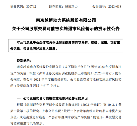 公告显示,越博动力2022年净资产为-4959万元至-1832万元。2022年扣非净利润亏损1.48亿元至1.79亿元。相关应收账款不能转让和确认营业外收入事项预计将导致公司2022年期末净资产为负。根据《深圳证券交易所创业板上市规则》相关规定,在公司2022年年度报告披露后,公司股票交易可能被实施退市风险警示。