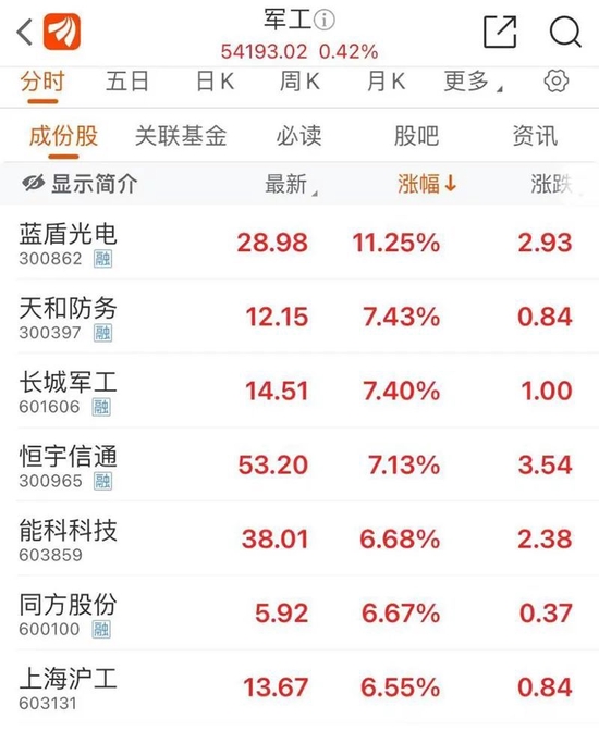 今日,国防军工板块逆势活跃,蓝盾光电涨超10%,天和防务、长城军工、恒宇信通等个股涨幅居前。