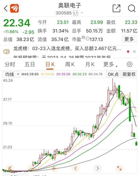 2022年12月,奥联电子公告与自然人胥明军共同成立公司,进军钙钛矿产业。受到该消息刺激,其股价一路飙升,最高涨至45.24元,两个月时间内累计涨幅超过200%。但是,近日胥明军的履历遭到华能清能院、两家前东家(众能光电、无锡众能)等多方“打假”,引发市场关注。