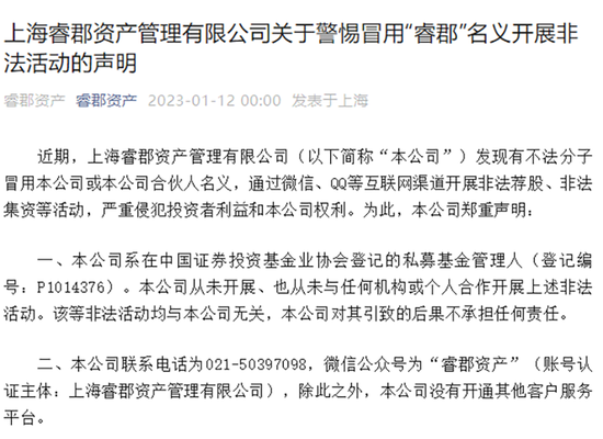 从公开资料来看,今年以来还有睿扬投资、睿郡资产等多家头部私募遭遇“李鬼”。比如,睿郡资产公告称,近期有不法分子冒用本公司或本公司合伙人名义,通过微信、QQ等互联网渠道开展非法荐股、非法集资等活动,严重侵犯投资者利益和本公司权利。睿扬投资也表示,近期有不法分子冒用公司图标、名字骗取钱财。
