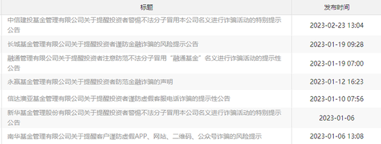 据记者不完全统计,今年以来,中信建投基金、长城基金、融通基金、永赢基金、信达澳亚基金、新华基金等近10家基金公司紧急发布公告,提醒投资者警惕不法分子冒用公司名义进行诈骗活动。