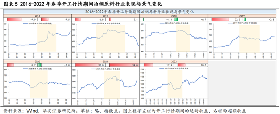 冶钢原料类公司主要从事生产和销售冶钢原料,如铁矿石或冶钢辅材为主业的公司。因此我们用铁矿石的价格变动来代表冶钢原料的景气变化。回顾过去7年开工行情期间,发现:①多数年份下,铁矿石材料的价格在开工行情期间是在改善的;②若铁矿石价格景气改善,则冶钢原料容易取得较高的绝对收益和相对收益率。如2016、2017、2021、2022年随着铁矿石价格的改善,均取得了不错的绝对收益率和超额收益率,而2020年尽管铁矿石景气在改善,且也取得了不错的绝对收益率,但并未取得超额收益率;③当铁矿石价格边际回落时,冶钢原料行情取得正收益率和超额收益率的难度都较大。如2018、2019年,开工行情期间铁矿石价格呈现回落弱势,均未取得超额收益。