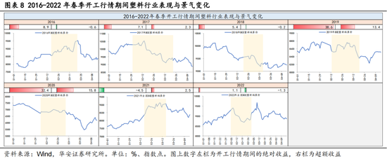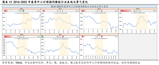 橡胶行业在开工行情期间取得正收益率的概率较大,但与景气基本没关系。橡胶行业在过去7年的开工行情中有6次都录得了正绝对收益,但这与景气变化基本没明显的相关性,无论是景气改善的年份如2016年,还是景气回落的年份如2017、2022年,还是景气整体平稳的年份如2018、2020年,还是景气大幅波动的年份如2019年,均能录得正收益率,因此这只能说明橡胶行业在开工行情期间取得正收益率的概率极大。此外橡胶行业取得超额收益率的概率较小,7年中有4年取得超额收益,但情形并不稳定,如有景气基本平稳的2018、2020年,有景气大幅波动的2021年,也有景气回落的2022年。