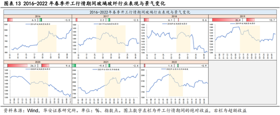 玻璃玻纤行业的在开工行情中的性价比不高,行情对景气的依赖程度也较低。玻璃玻纤行业在过去7年的开工行情中有6次录得了正绝对收益,但仅有3次录得了超额收益。从过去7年的玻璃开工行情来看:当玻璃景气企稳或者向好时,玻璃板块取得正收益的概率较大,但不一定能取得超额收益。如景气企稳或向好的2016(6.5%,-3.0%)、2018(6.1%,0.6%)、2020(26.2%,9.6%)、2021(-9.4%,-2.4%)年,2016、2018、2020年都取得了正收益率,2021年未取得正收益率,而仅有2020年取得了超额收益。另一个角度,当玻璃景气弱势或者回落时,玻璃板块也不一定下跌,但取得超额收益率的概率较低。如2017(2.2%,-2.5%)、2019(35.8%,10.7%)、2022(1.5%,-0.9%)年,均实现了正收益率,但仅2019年有超额收益。