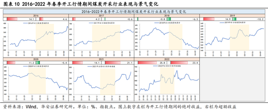 煤炭开采行业的开工行情收益率和超额收益率高度依赖于景气变化。在过去7年的开工行情和景气边际变化对比中可以发现:①在行业景气上行的所有年份中,如2016、2017、2019、2021、2022年,煤炭开采行业都录得了较不错的正绝对收益率,也容易录得较为可观的超额收益率,主要体现在2016、2021、2022年,2017年超额收益率小幅为负;②在行业景气下行的所有年份中,如2018、2020年,煤炭开采行业皆未能取得超额收益率。说明煤炭开采行业的开工行情与其景气变化关系非常密切,主要表现为:当行业景气上行时,能取得不错的正收益率,且较容易取得超额收益率;当行业景气回落时,很难取得超额收益率。